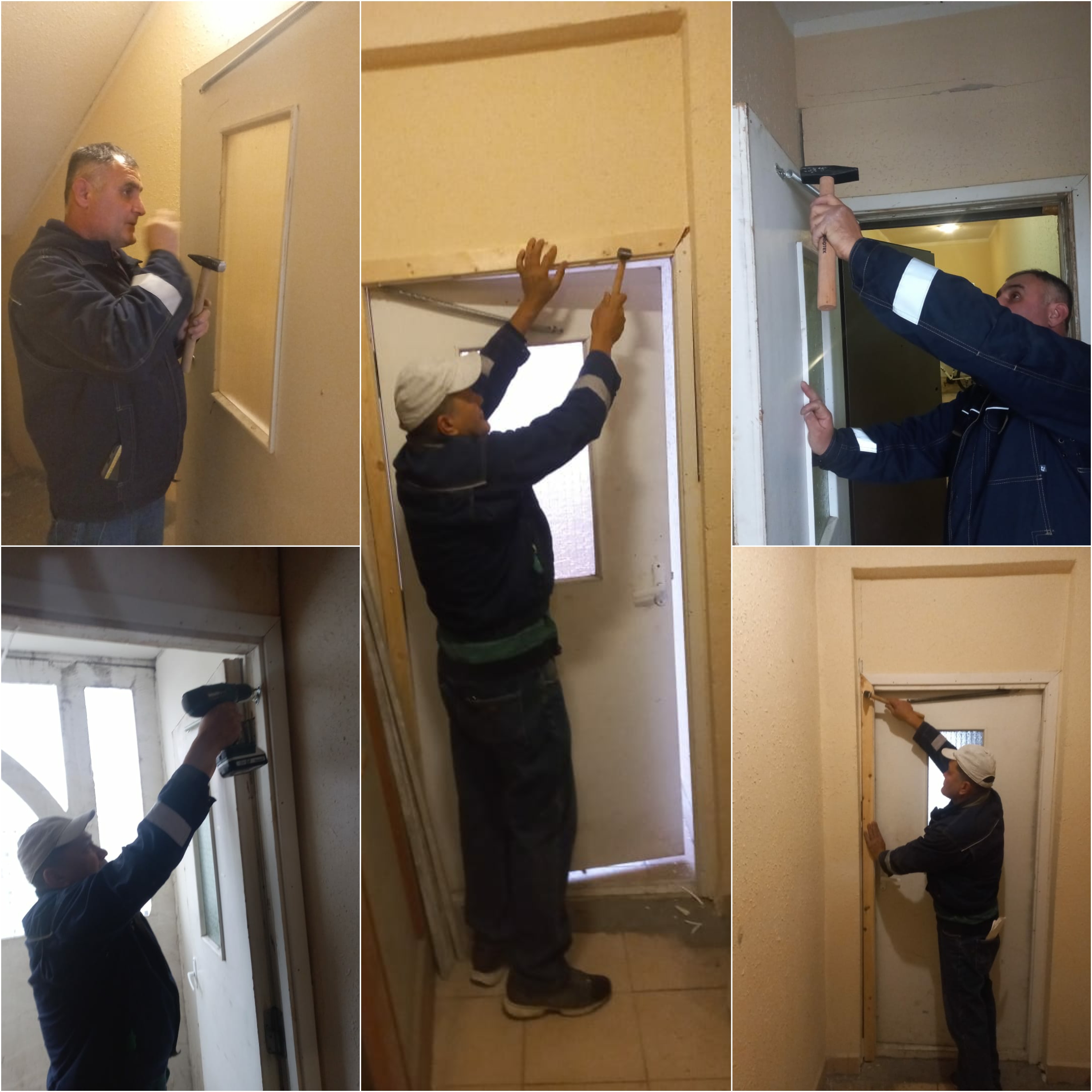 — Комплексный ремонт переходных дверей с утеплением, установкой пружин и ручек, заменой битых стекол (ул. Чистяковой, 80, п.3);