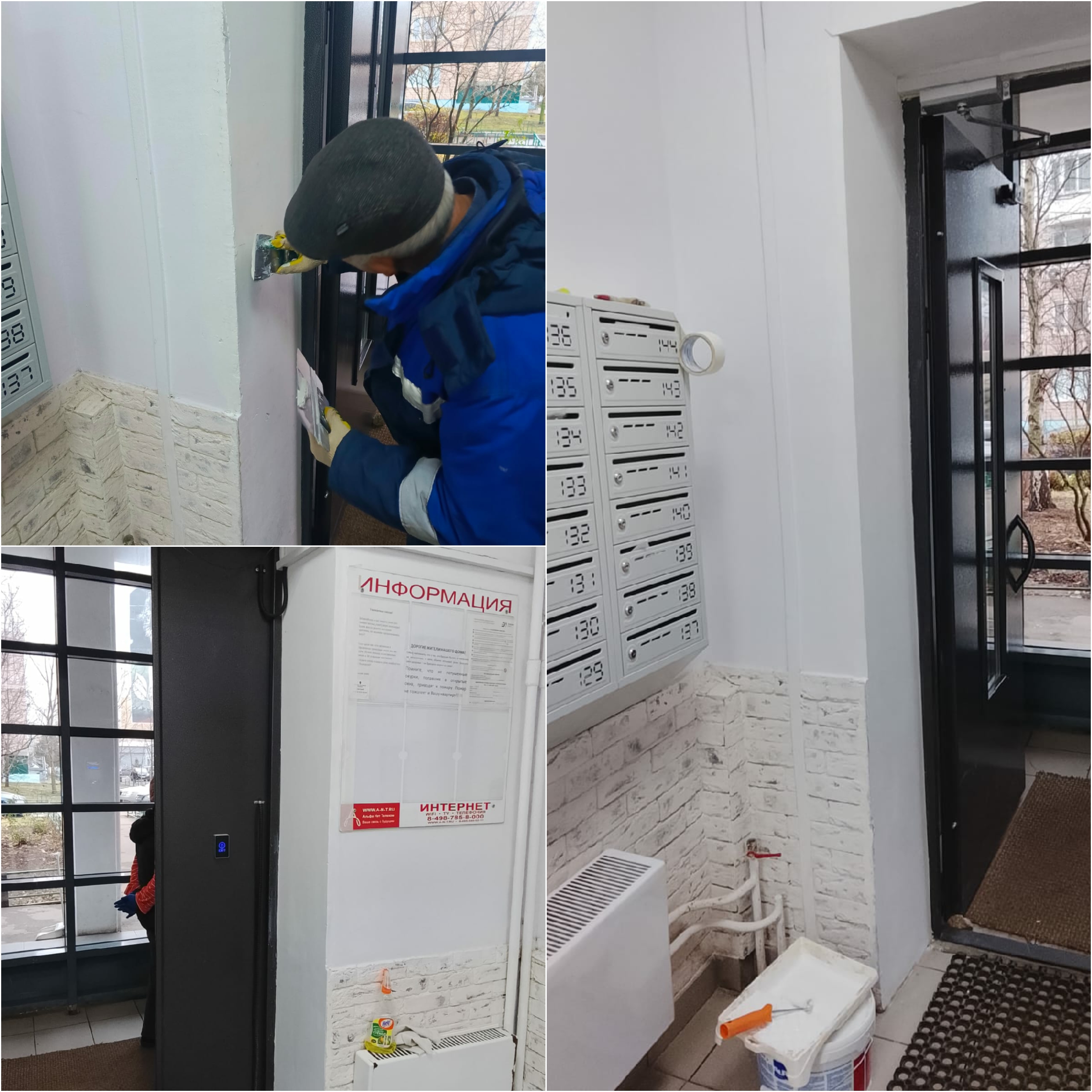 — Ремонт, регулировка доводчиков на дверях входных групп (ул. Кутузовская, 1, п.1; ул. Кутузовская, 2, п.1; ул. Кутузовская, 17, п.3; ул. Чистяковой, 80, п.2), монтаж доводчика на тамбурную дверь (ул. Кутузовская, 1, п.2, 2 эт.) и ремонт (ул. Кутузовская, 35, п.5, 1 эт.);