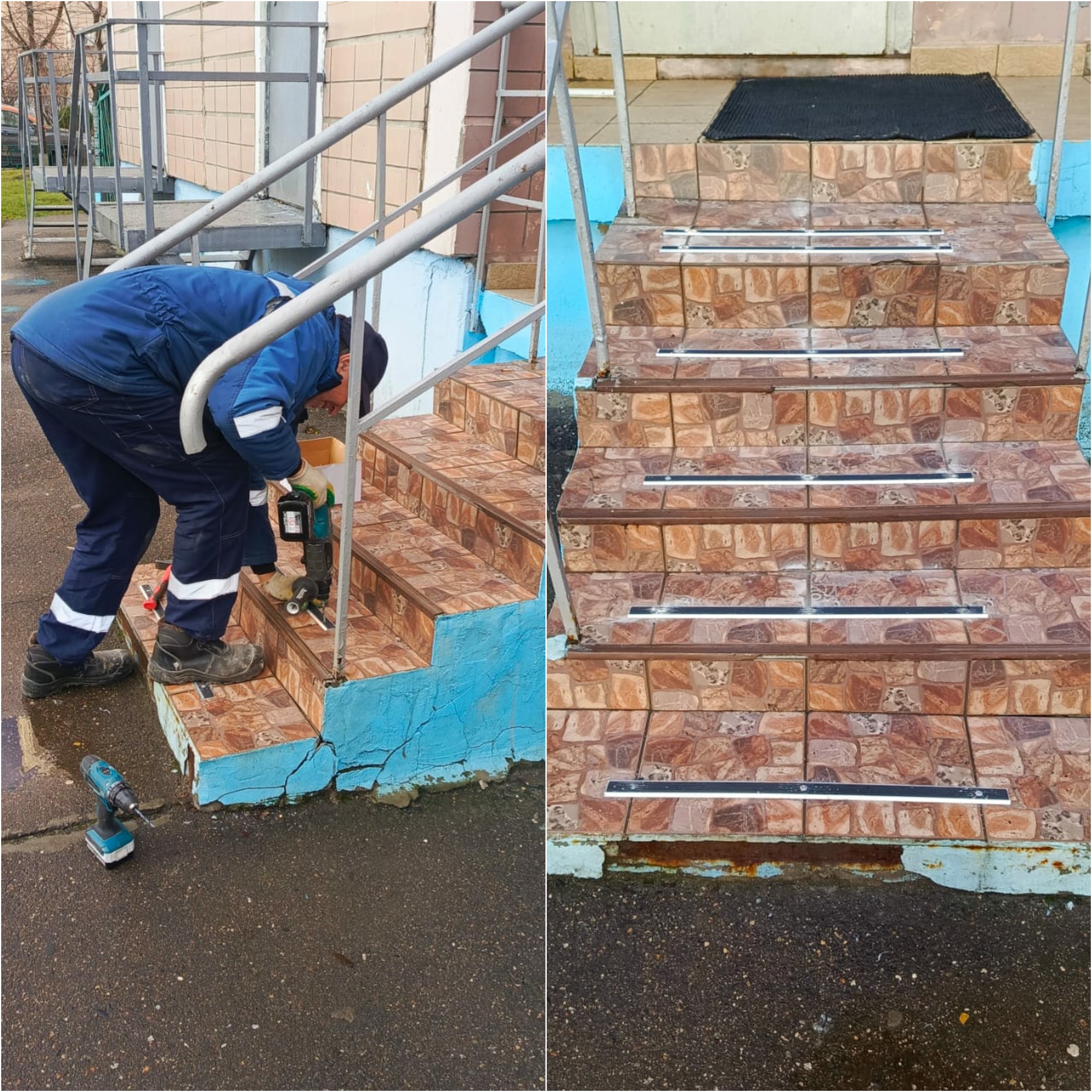 — Монтаж противоскользящих полосок на крыльце запасного выхода (ул. Кутузовская, 74Б).