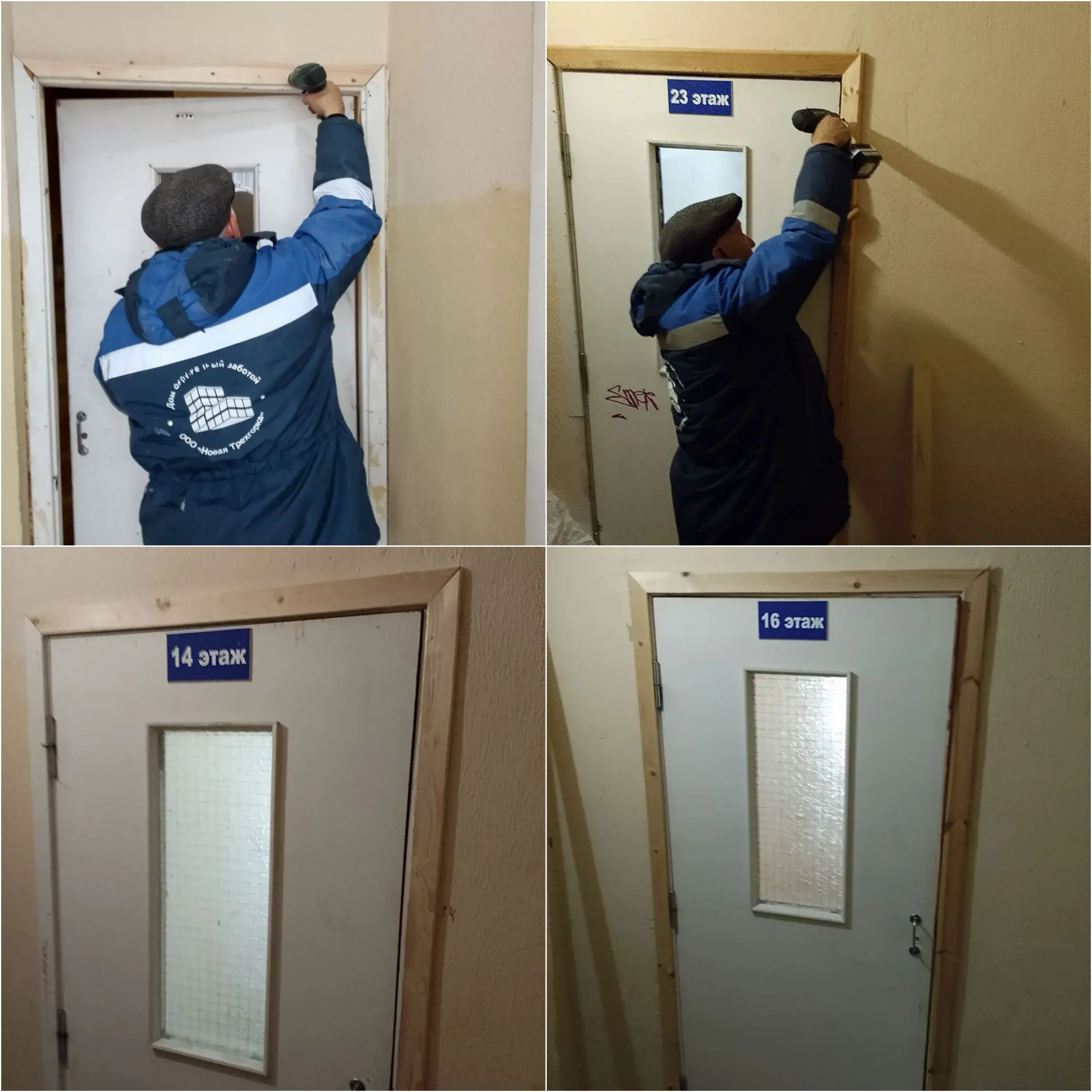 — Ремонт дверей входных групп (ул. Кутузовская, 2, п.3; ул. Кутузовская, 72А), тамбурных дверей (ул. Кутузовская, 9, п.7; ул. Чистяковой, 76, п.4, 1 эт.), переходных дверей (ул. Кутузовская, 1, п.1, 7 эт.; ул. Кутузовская, 74Б, 2 эт.), двери запасного выхода (ул. Чистяковой, 52, п.2), двери помещения ВРУ (ул. Кутузовская, 74Б), двери выхода на кровлю (ул. Чистяковой, 76) и двери подвального помещения (ул. Кутузовская, 31, п.1);
