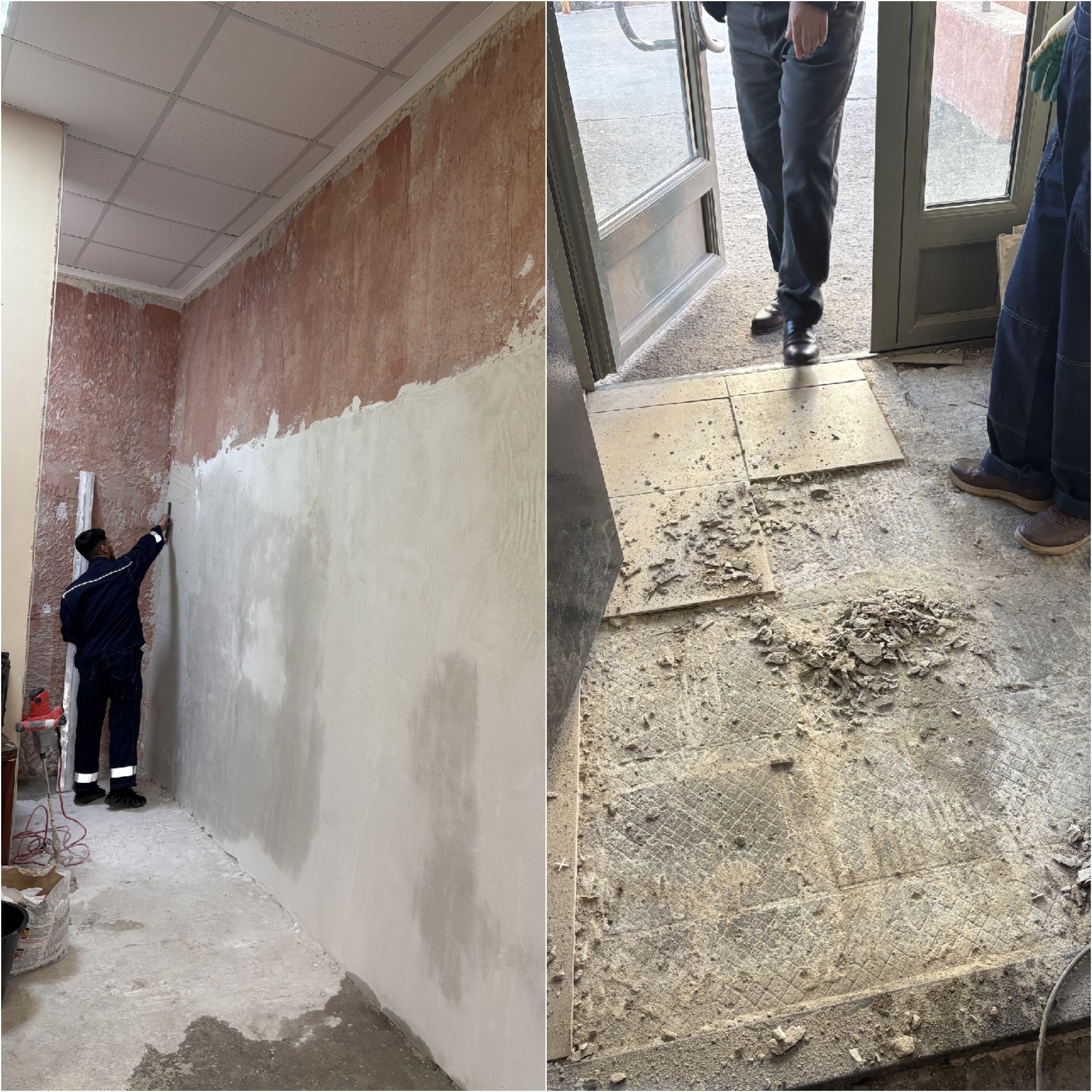 — Продолжаются ремонтные работы в подъезде с оштукатуриванием стеновой поверхности в вестибюле и демонтажем напольной плитки в тамбуре входной группы (ул. Чистяковой, 48, п.1);